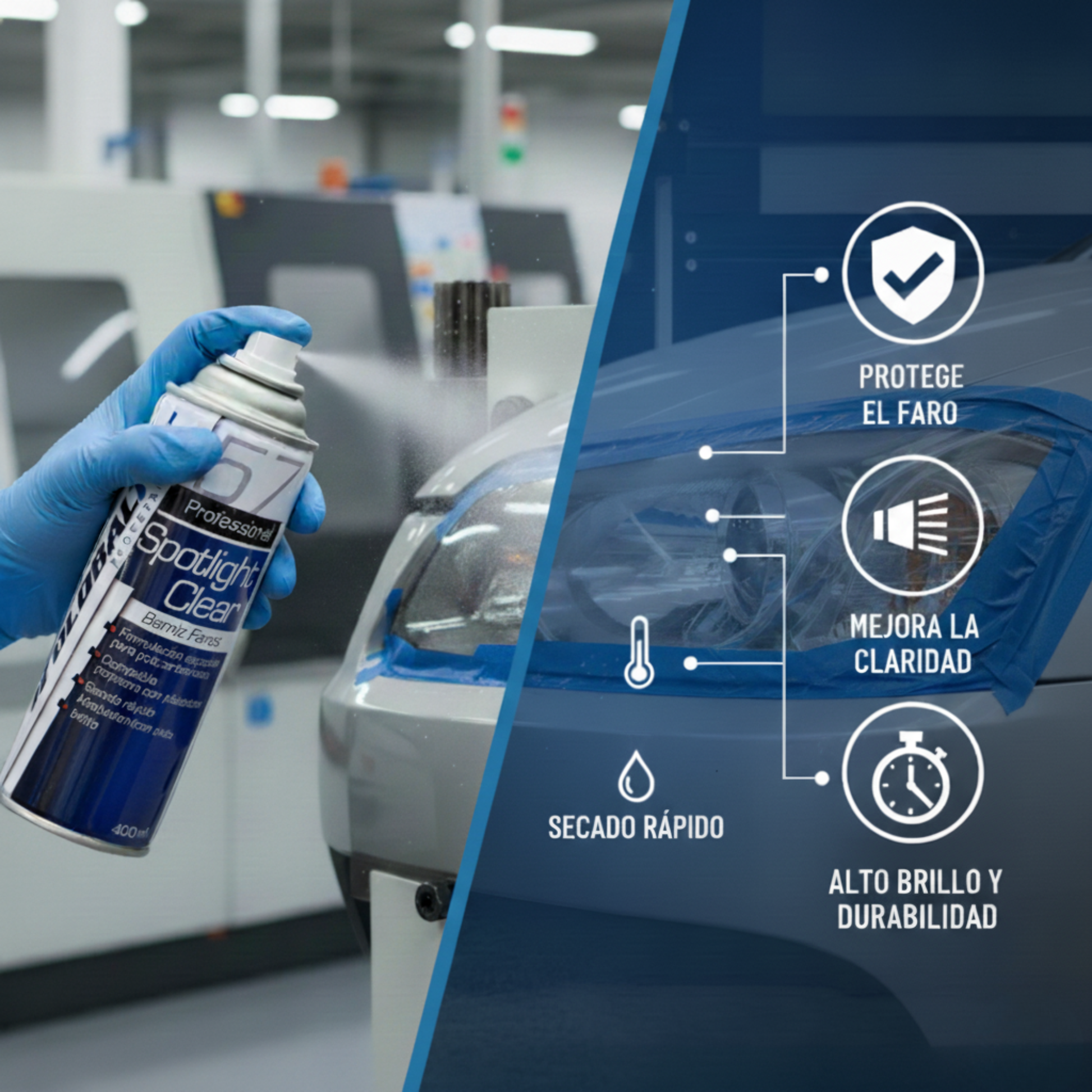 El barniz 1K es un recubrimiento transparente de secado rápido que se aplica en spray para proteger y restaurar las ópticas de los vehículos. Se utiliza especialmente en faros de policarbonato, ofreciendo brillo, resistencia y protección contra rayos UV.