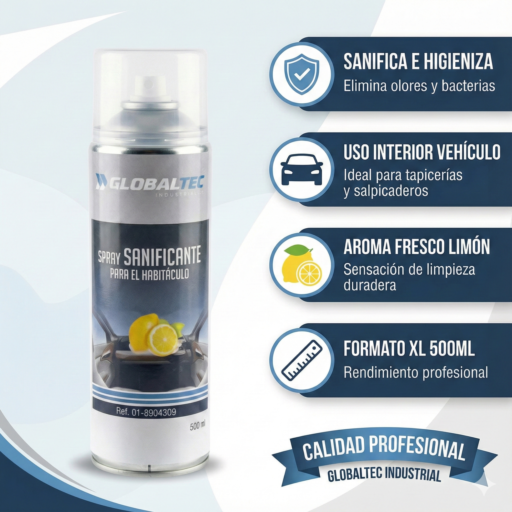 El Desinfectante para Habitáculos de Globaltec Professional está diseñado para garantizar la máxima higiene en el interior de vehículos, eliminando bacterias, virus y malos olores de manera rápida y segura. Su fórmula profesional es apta para coches, furgonetas y vehículos comerciales, ofreciendo una protección completa sin dañar superficies interiores como plásticos, vinilos o tapicerías.
